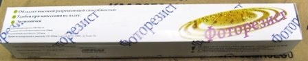 1. Фоторезист пленочный, бывает негатив/позитив и еще индикаторный (у меня это пленочный негатив, 300х500, стоимость 90 р.). Негативный - это тот который закрепляет просвеченные участки пленки, так что потом только ацетоном ототрешь. ФР имеет срок годности, берите свежак!