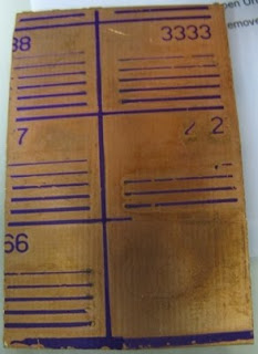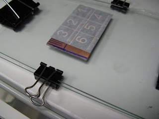 6. Кладем заготовку под ультрафиолетовую лампу матрицей вверх. Чтобы ультрафиолет светил через маску на плату с нанесенным ФР. И выдерживаем определенное время. А вот теперь самое неблагодарное: определение времени экспонирования. Зависит это от мощности лампы, расстояния от лампы до заготовки, от материала стекла (пластик или стекло и его толщина), толщины кальки, возможно тонера от вашего принтера. Если один из параметров меняется - то время меняется причем не совсем предсказуемо. Время облучения определяется опытным путем. Берется матрица, скажем с 6 квадратиками, в которых цифры и может быть дорожки разной толщины. И каждые 2 минуты облучения листом картона закрывается квадратик один за одним. Далее все проявляется и смотрим где - лучше всего. Если скажем 3-й квадрат - то оптимальное время засветки - 6 минут.